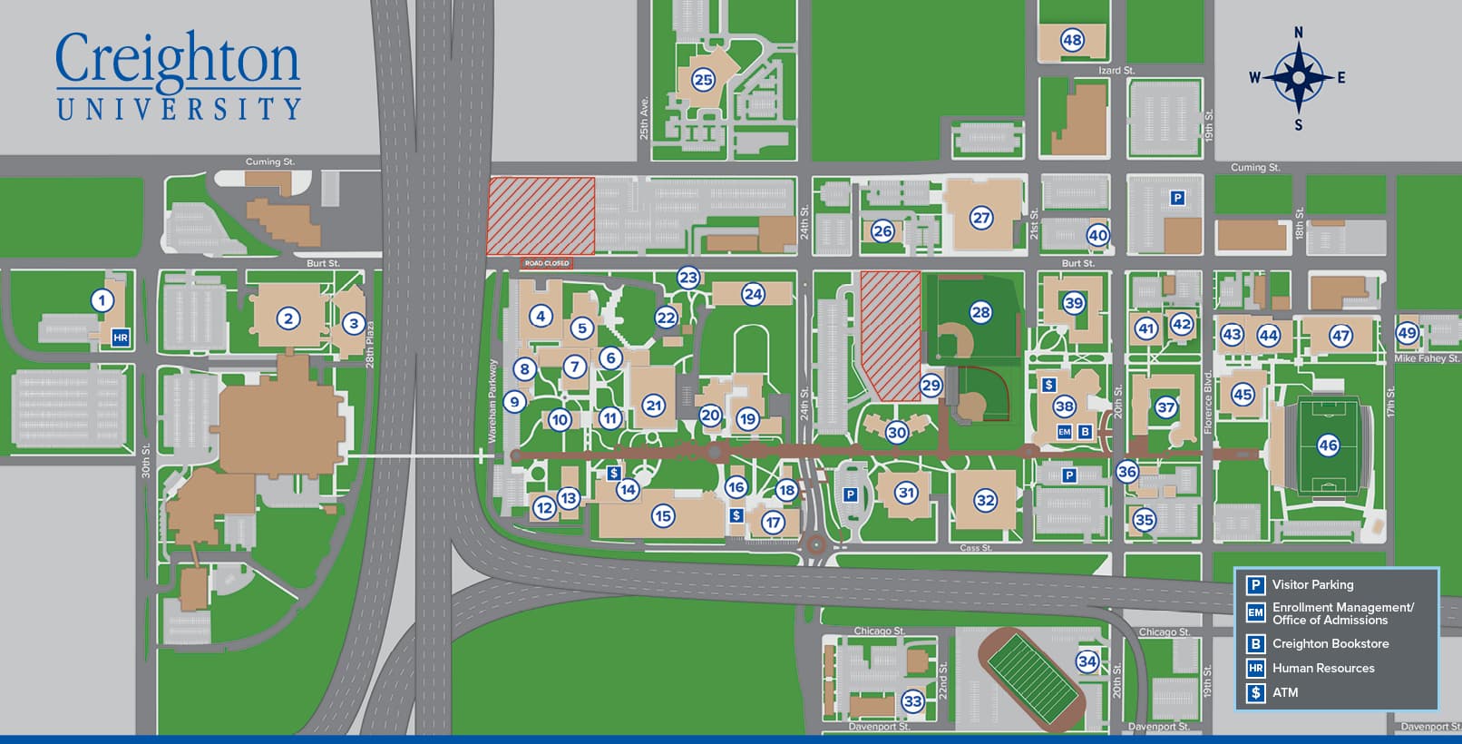 Creighton University Campus Map. Creighton University Campus Map Creighton University (CU) is a private Jesuit university in Omaha, Nebraska B Creighton Bookstore Enrollment Management/ O˜ce of Admissions EM HR Human Resources Ahmanson Law Center 31 Beirne Research Tower 8 Brandeis Dining Hall 14 Cardiac Center 1 CHI Health Creighton University Medical Center-University Campus 21 Creighton Hall 16 Criss Complex I 7 Criss Complex II-III 3 Davis Square Apartments 38 Deglman Residence.